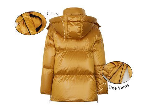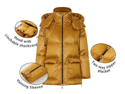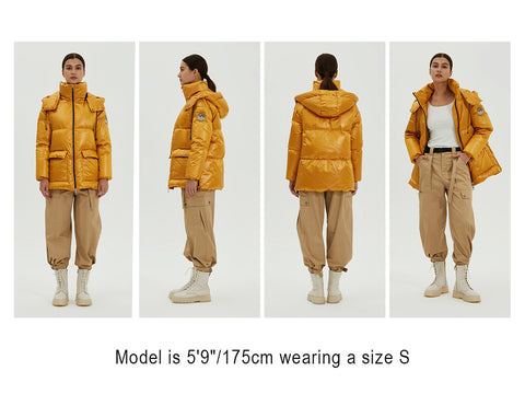 Eileen is a down puffer jacket for women with a stand collar and removable hood for enhanced versatility. An on-trend oversize fit, an adjustable storm visor, baggy pockets, Openning on sleeve and hem, and elastic cuffs deliver ultimate warmth without feeling too overheating. Engineered for superior protection with design-forward details.