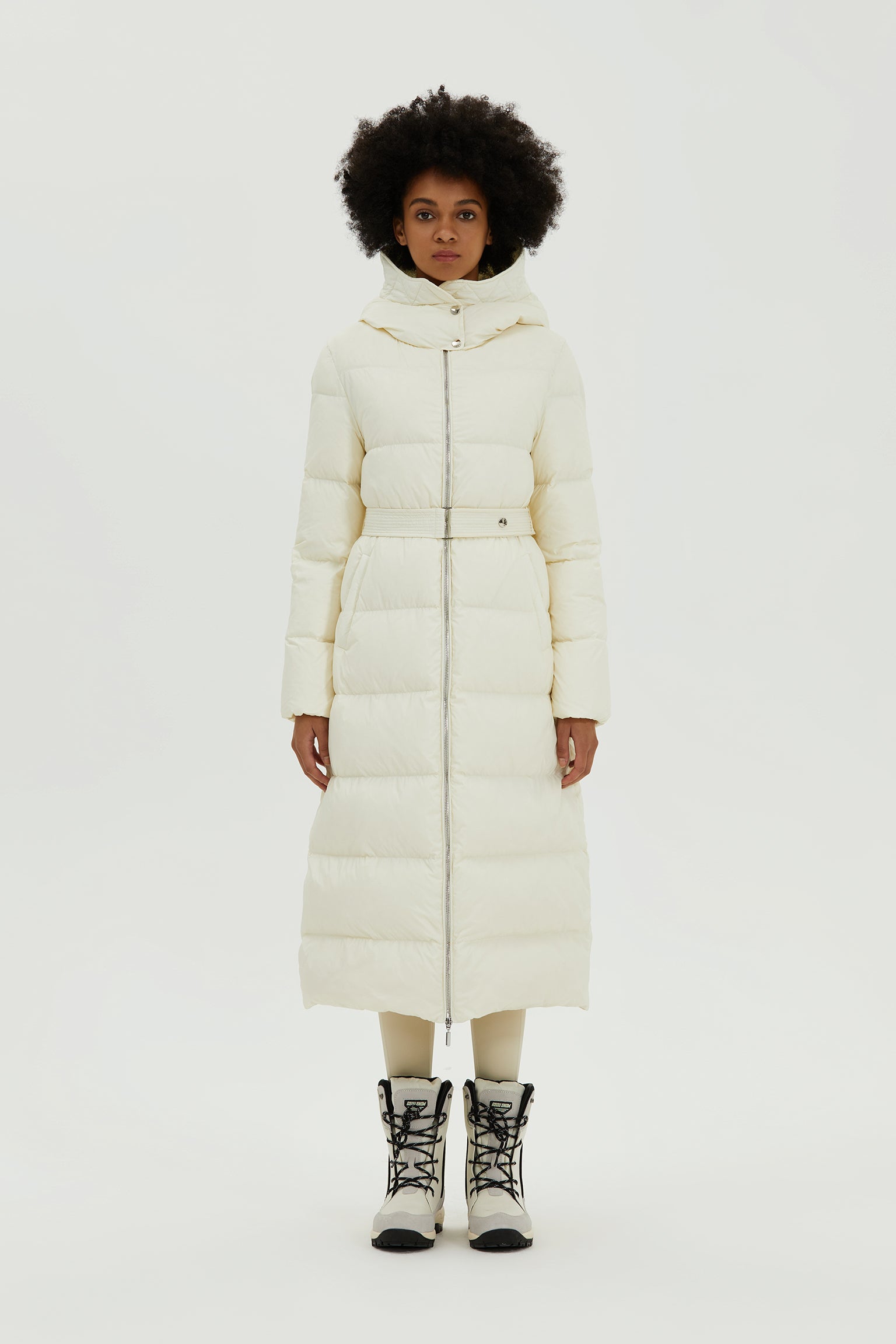 The Bonnie Women's Jacket is a long, full coverage down jacket generously filled with natural down. It has dropped shoulders and elegant lines with warm design features for a contemporary and timeless style. Engineered to deliver warmth to -30°C / -22°F, this is a long quilted puffer with a weather-shield hood to protect you from the elements. It's filled with 700+ fill-power duck down for superior warmth with less weight, so this padded jacket for women is the ideal choice to face winter. Equipped with a monochrome, double-tab zipper and convenient side pockets, it’s made with water-repellent fabric with a soft, slick feel. The waist is cinched by an adjustable belt for glamorous, feminine style.