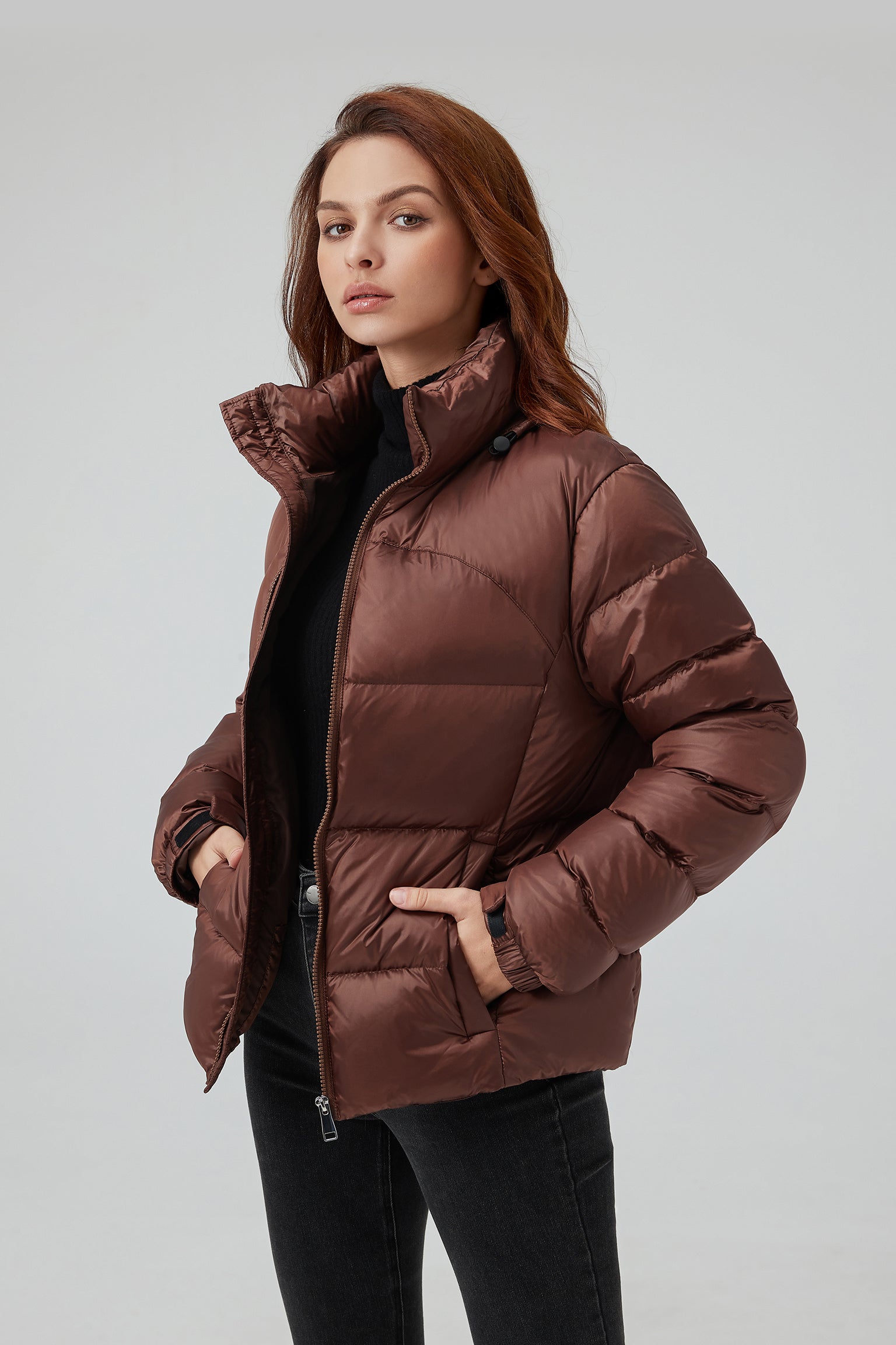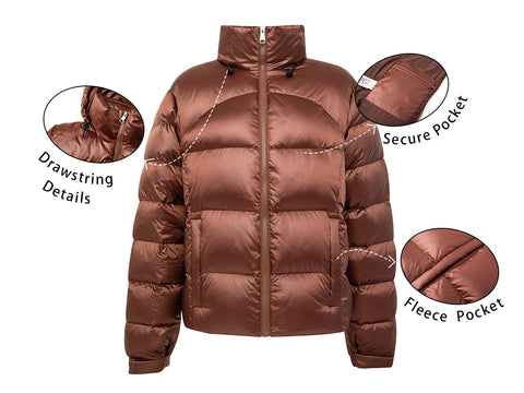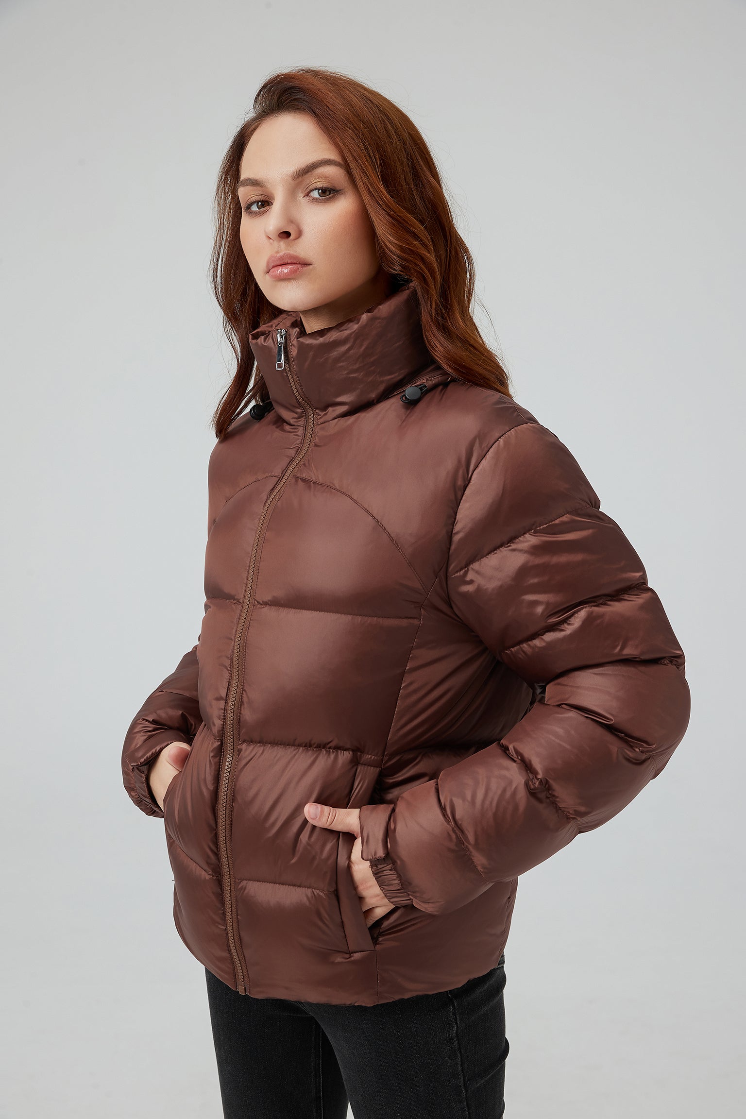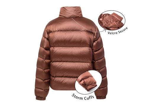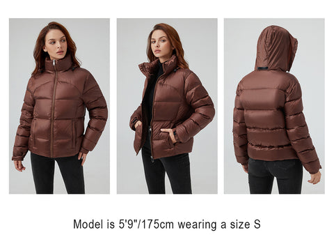 This Los winter puffer coat for women is characterized by its dynamic design with a drawcord hood, adjustable cuffs and a zipper placket which helps customize fit and block out cold winds. The relaxed-fit, cropped, and boxy silhouette women's short puffer jacket that features a water-resistant ripstop fabric will open the door to city life. Equipped with ultra-lightweight down, this coat provides optimal warmth without ever feeling heavy.