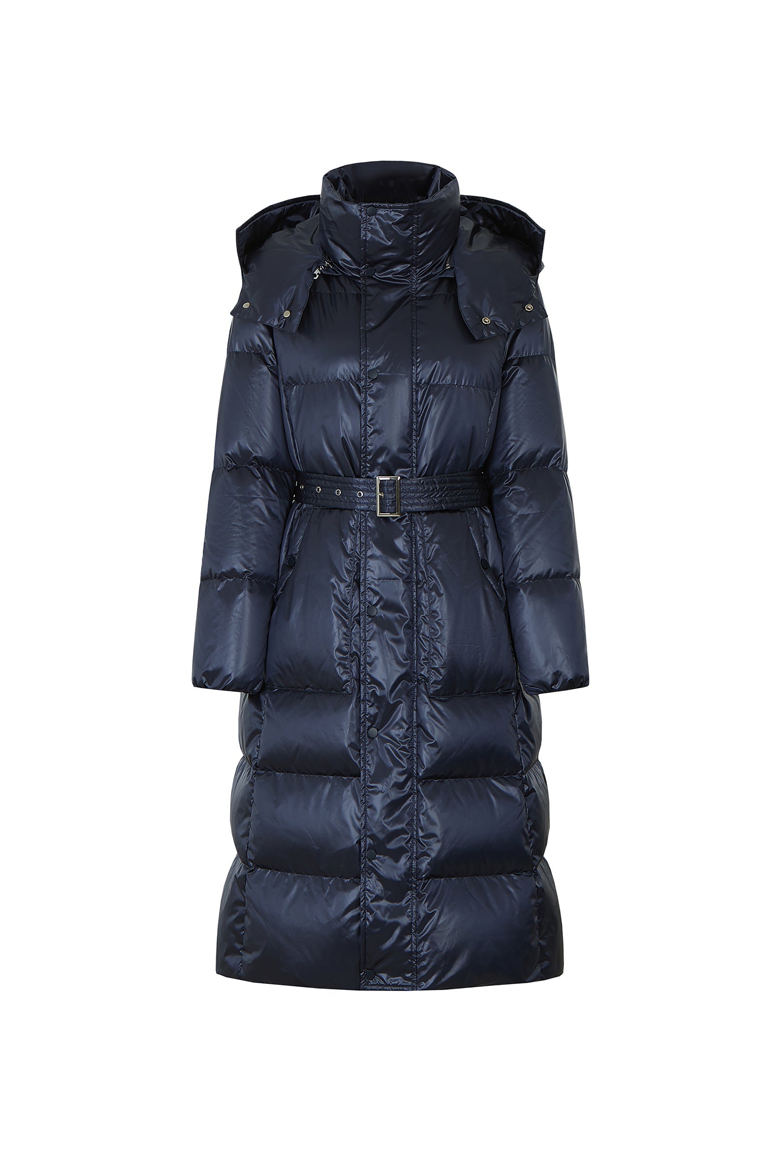 Fitouch Nicole women's puffer jacket combines long, a fitted a-line cut, elegant lines with warm design features. Made from shiny, water-repellent nylon, it is styled with classic, horizontal padding. A soft and convenient hood block out the cold. This coat is equipped with a monochrome, double-tab zipper and button closure and convenient side pockets, while removable belt deliver versatile protection and fit.