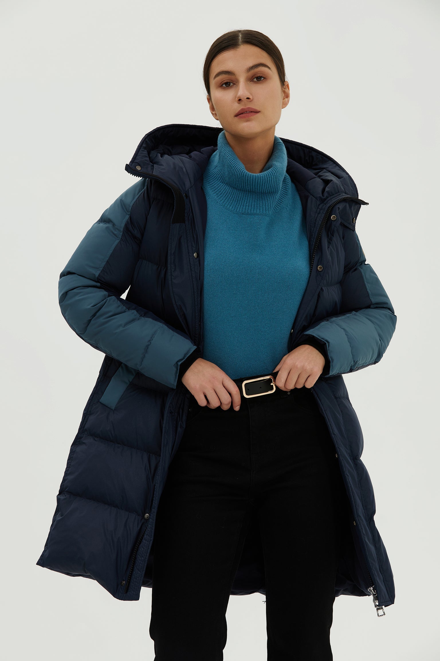 The women's York long down jacket is a slim-fit and flattering which maintains a distinctly feminine silhouette. The contrast color on sleeve defines the design in a bold, graphic way, while side snap vent on bottom allows you to effortlessly start your urban adventure. This style is crafted in 700+ fill premium down and water-repellent nylon fabric that keeps your upper body, hips and upper thighs cozy and protected from harsh winter weather.